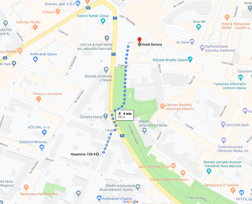| HOTEL KORUNA ***/**** Nám. Republiky 17 746 01 Opava www.hotelkoruna.cz/en Distance: 10 minutes walk |